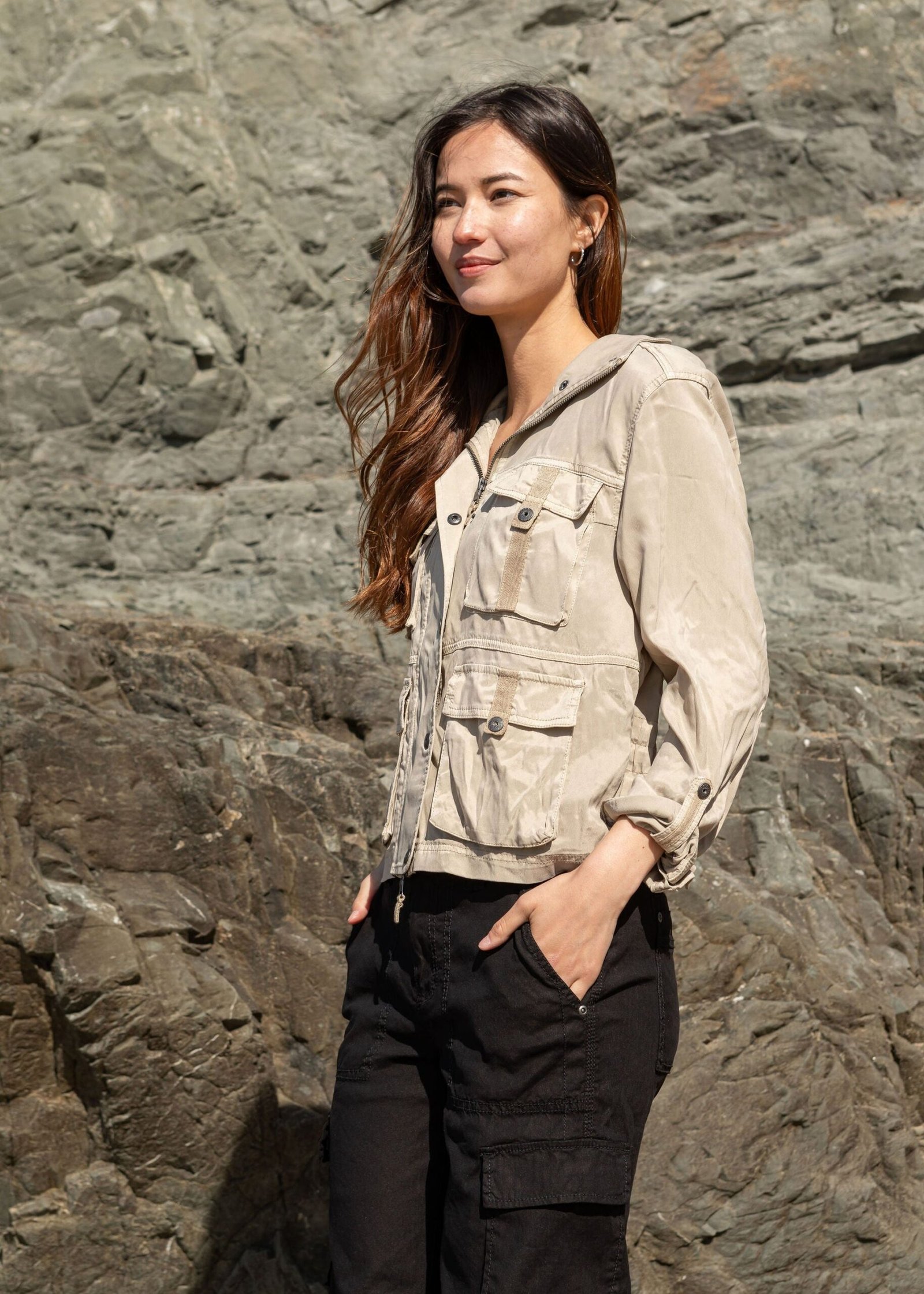 Get ready to conquer your summer adventures with the Autumn Stretch Cupro Utility Jacket. This lightweight gem is perfect for everything from beach bonfires to late-night hangs with your besties. making it your new favorite go-to piece.