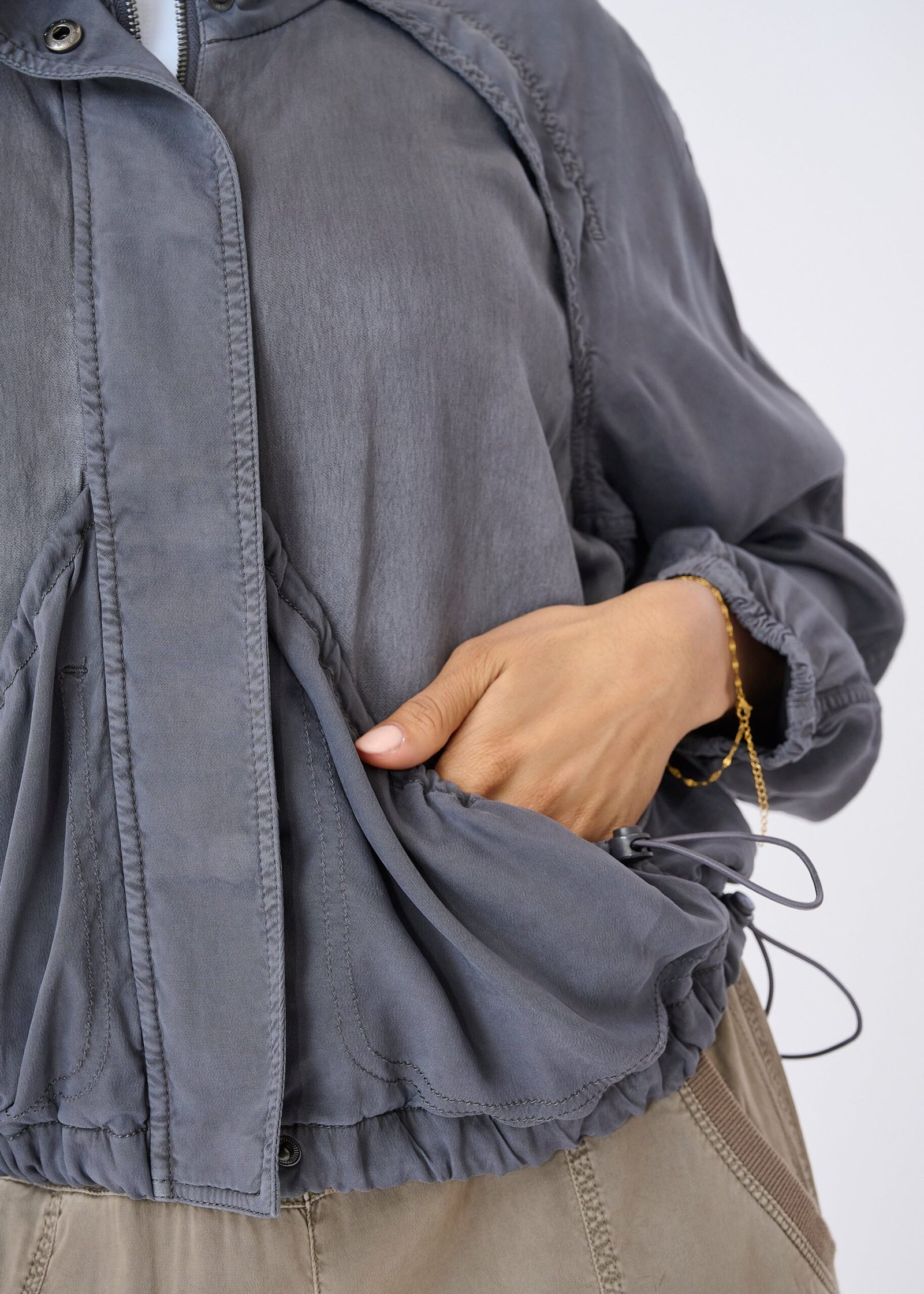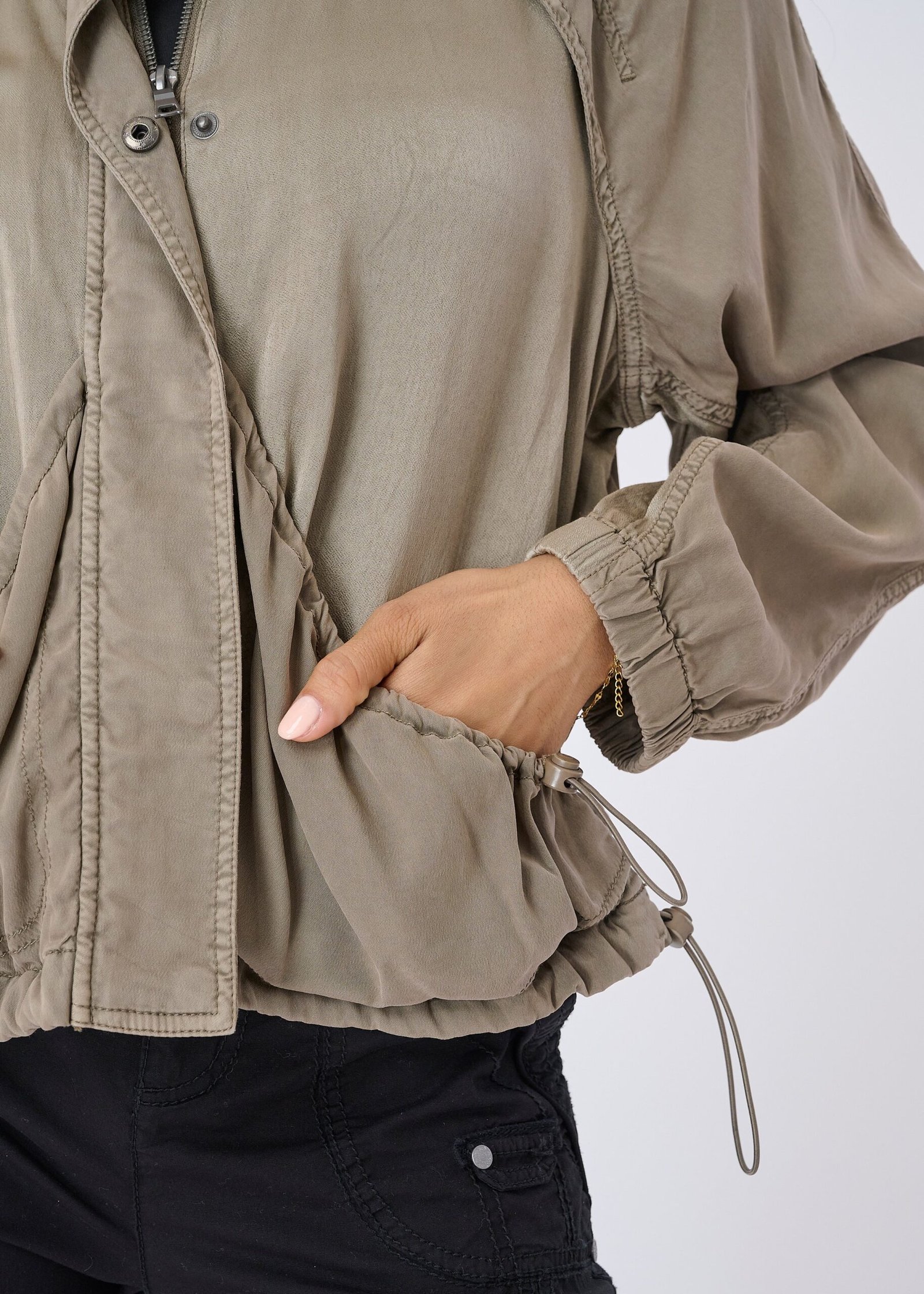 3. Modern Details: Snap button and zipper closures. plus adjustable toggle front drapey pockets. combine practicality with sleek design.