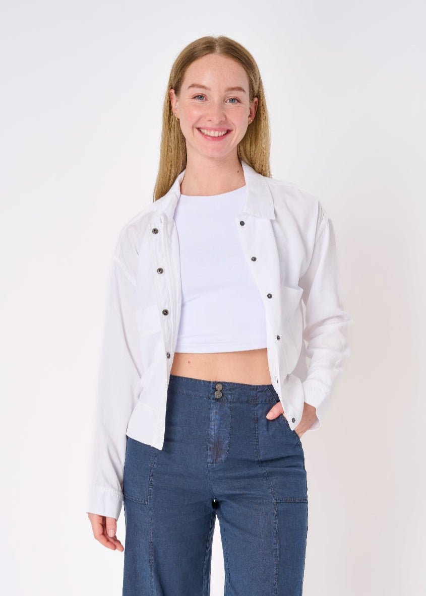 Meet the Cannes Lyocell Boxy Jacket. your new go-to for effortless layering. Designed with a relaxed. drop-shoulder fit and crafted from ultra-soft lyocell. this lightweight jacket offers the perfect balance of structure and comfort. The snap-button front and pointy collar add a polished touch. while the breathable fabric makes it ideal for transitional spring days. Whether styled casually or elevated with tailored pieces. this versatile layer will be your new seasonal staple.