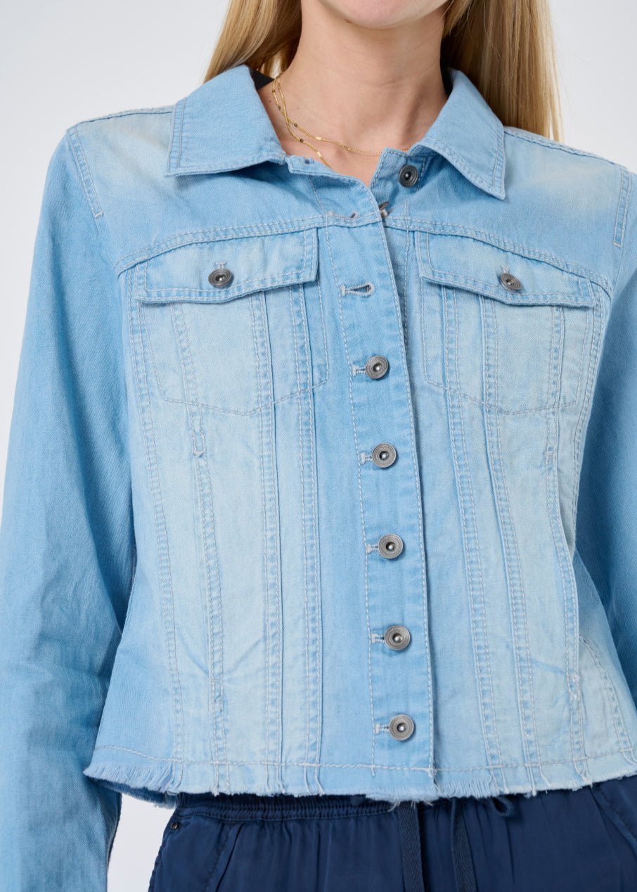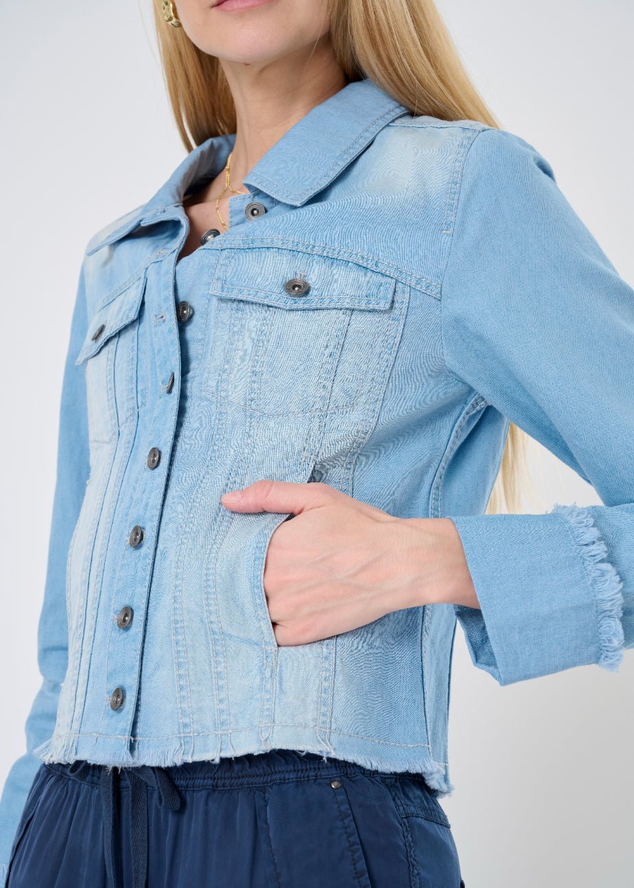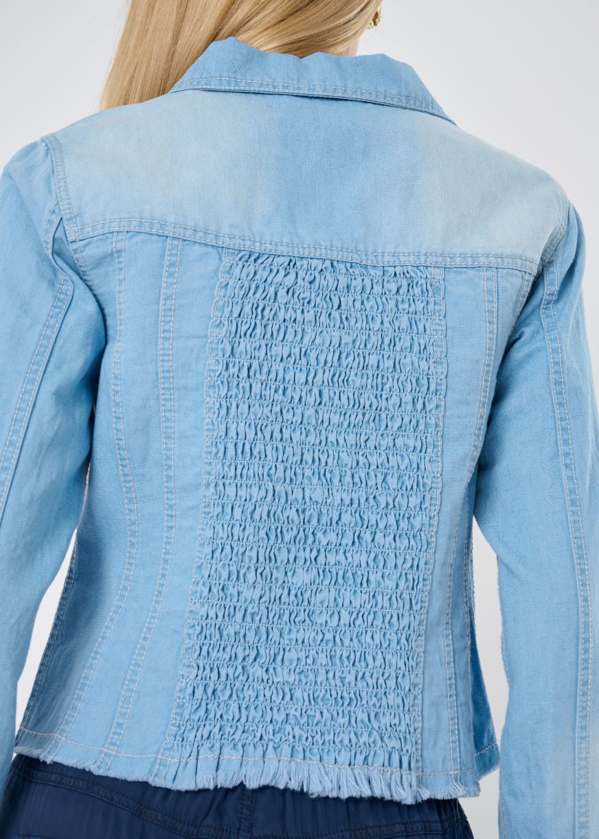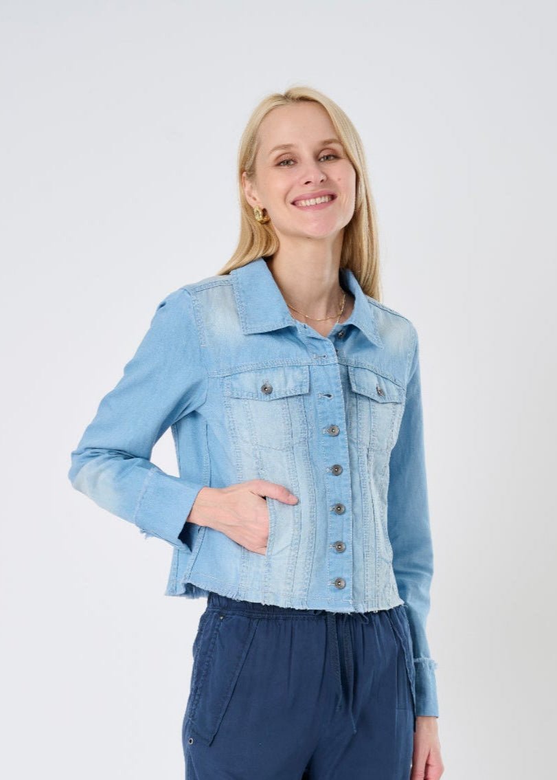 The Charleston Denim Frayed Edge Corset Trucker Jacket is one of those rare finds—familiar. yet refreshingly distinct. Available in two versatile denim washes. this piece brings together vintage trucker charm with a more sculpted. feminine silhouette. Thoughtful seaming. frayed edges. and a flattering ruched back panel create subtle shaping that highlights the waist without ever feeling restrictive.