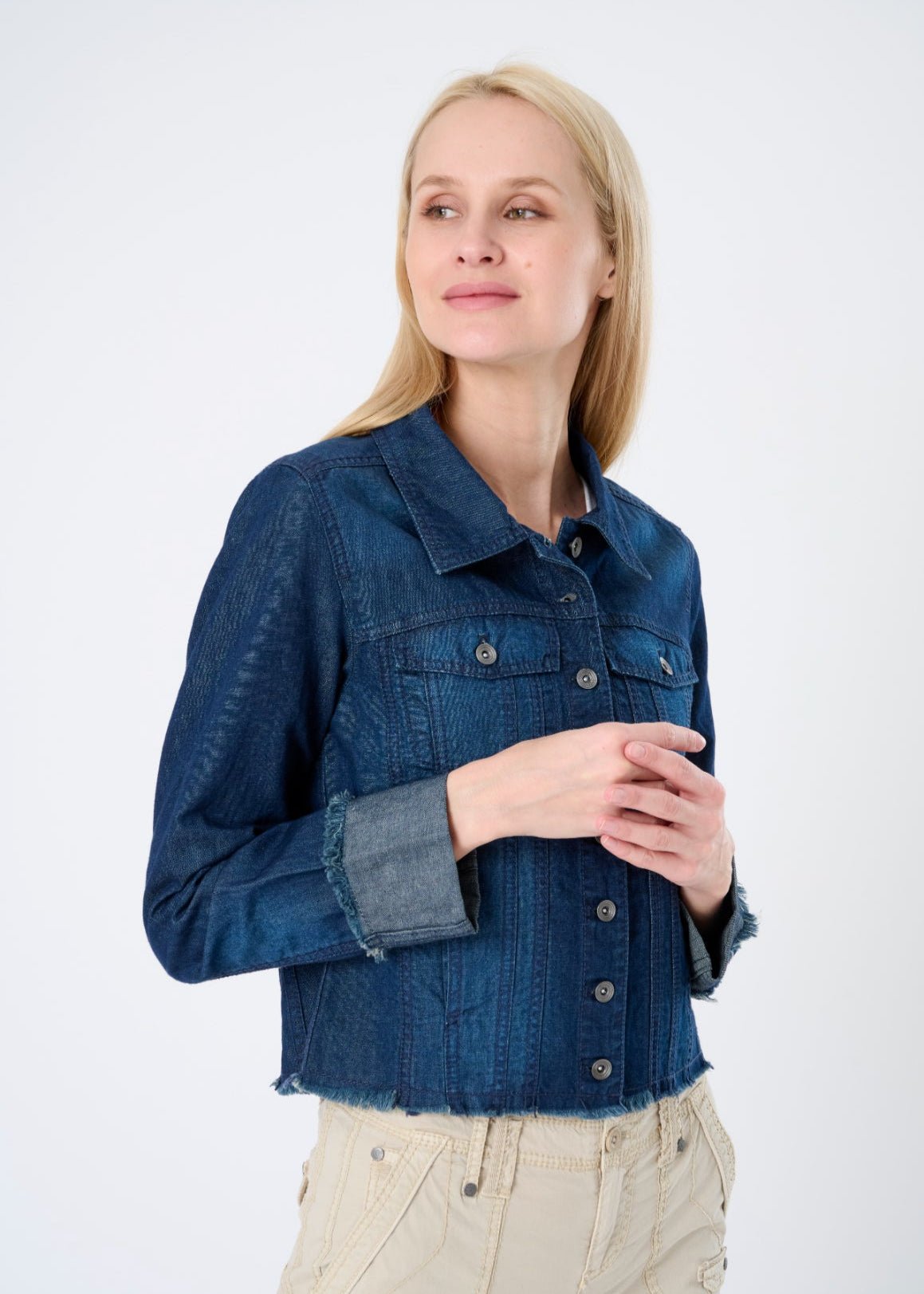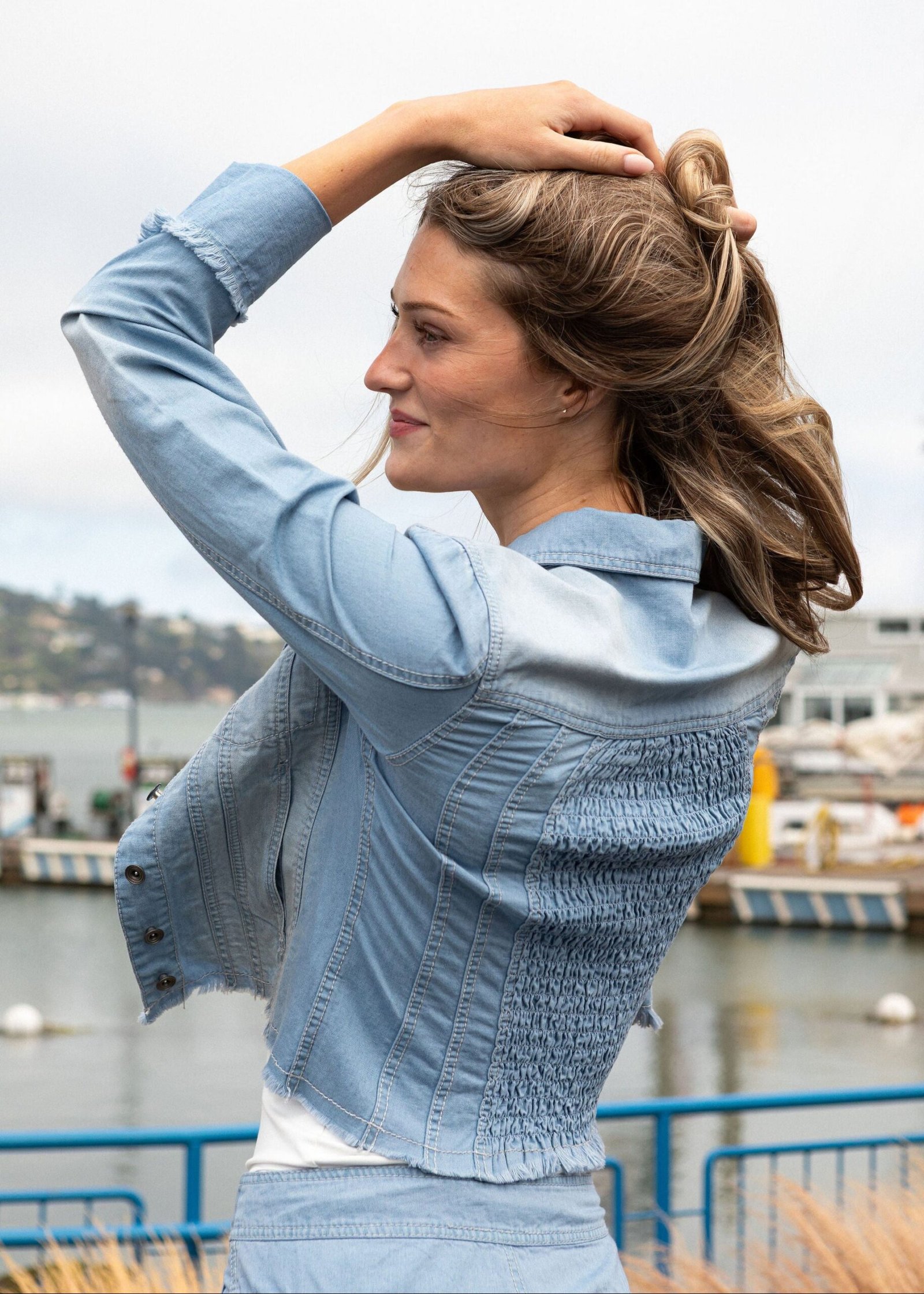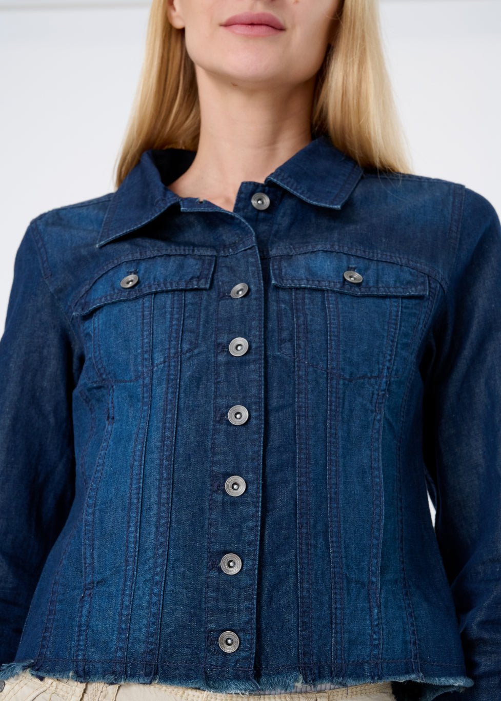The Charleston Denim Frayed Edge Corset Trucker Jacket is one of those rare finds—familiar. yet refreshingly distinct. Available in two versatile denim washes. this piece brings together vintage trucker charm with a more sculpted. feminine silhouette. Thoughtful seaming. frayed edges. and a flattering ruched back panel create subtle shaping that highlights the waist without ever feeling restrictive.