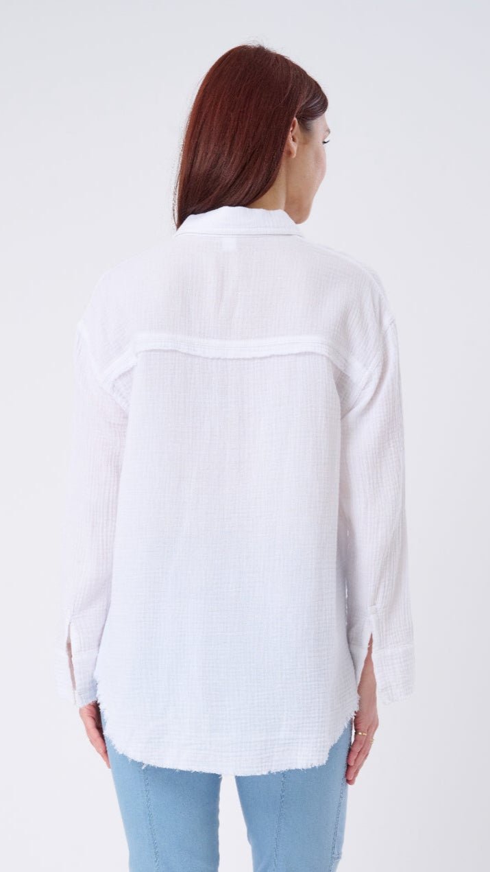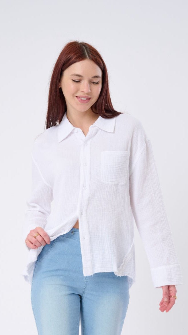 Remember when effortless style meant throwing on your favorite button-down and instantly feeling polished? The Marbella Oversized Crinkle Cotton Shirt brings back that timeless ease—with a subtle nod to European flair. Made from ultra-soft. breathable cotton with a lightweight crinkle texture. this shirt features relaxed drop shoulders. a roomy oversized fit. and frayed edges that give it a perfectly lived-in look.