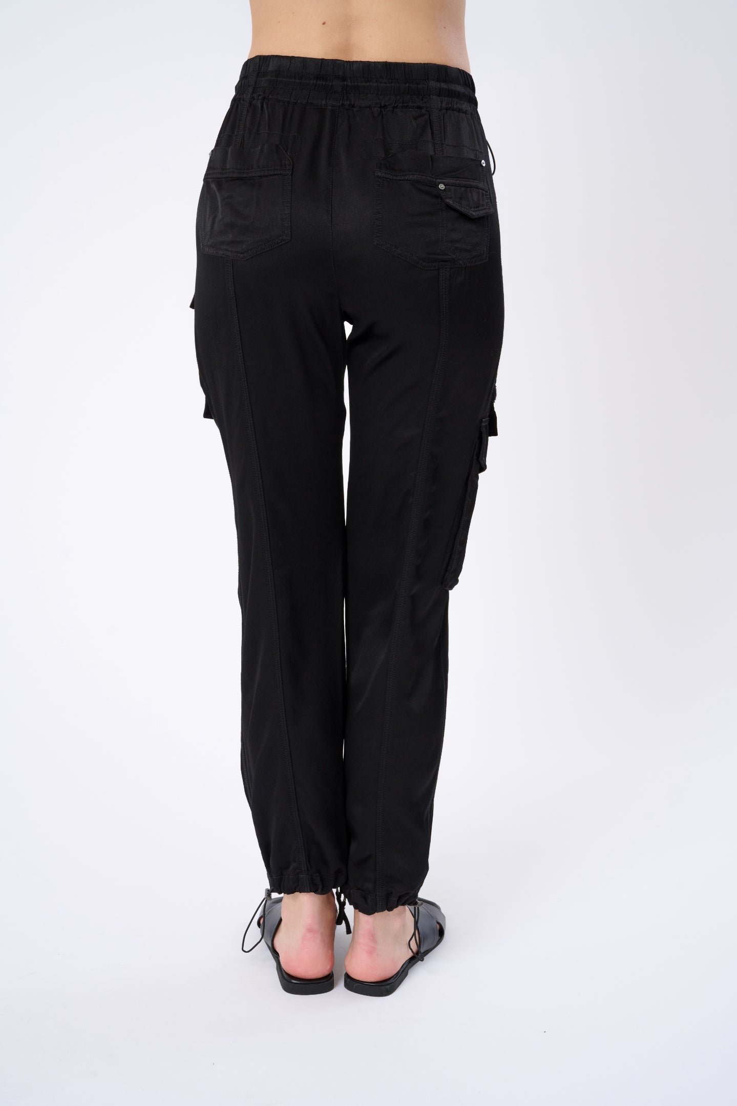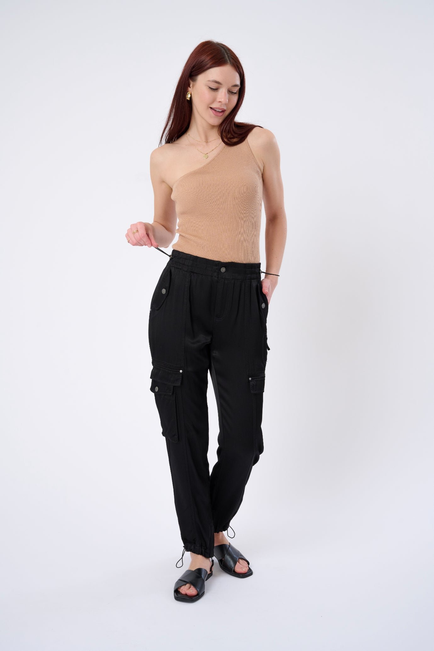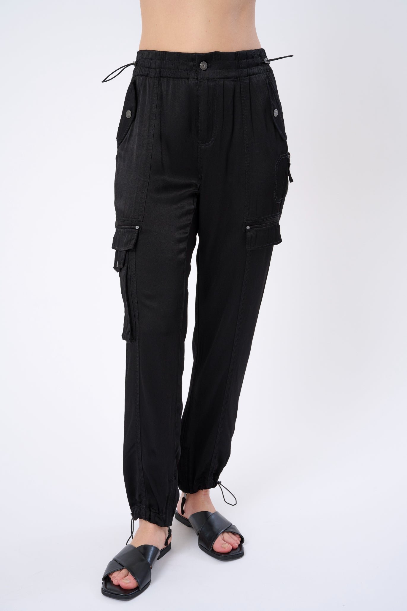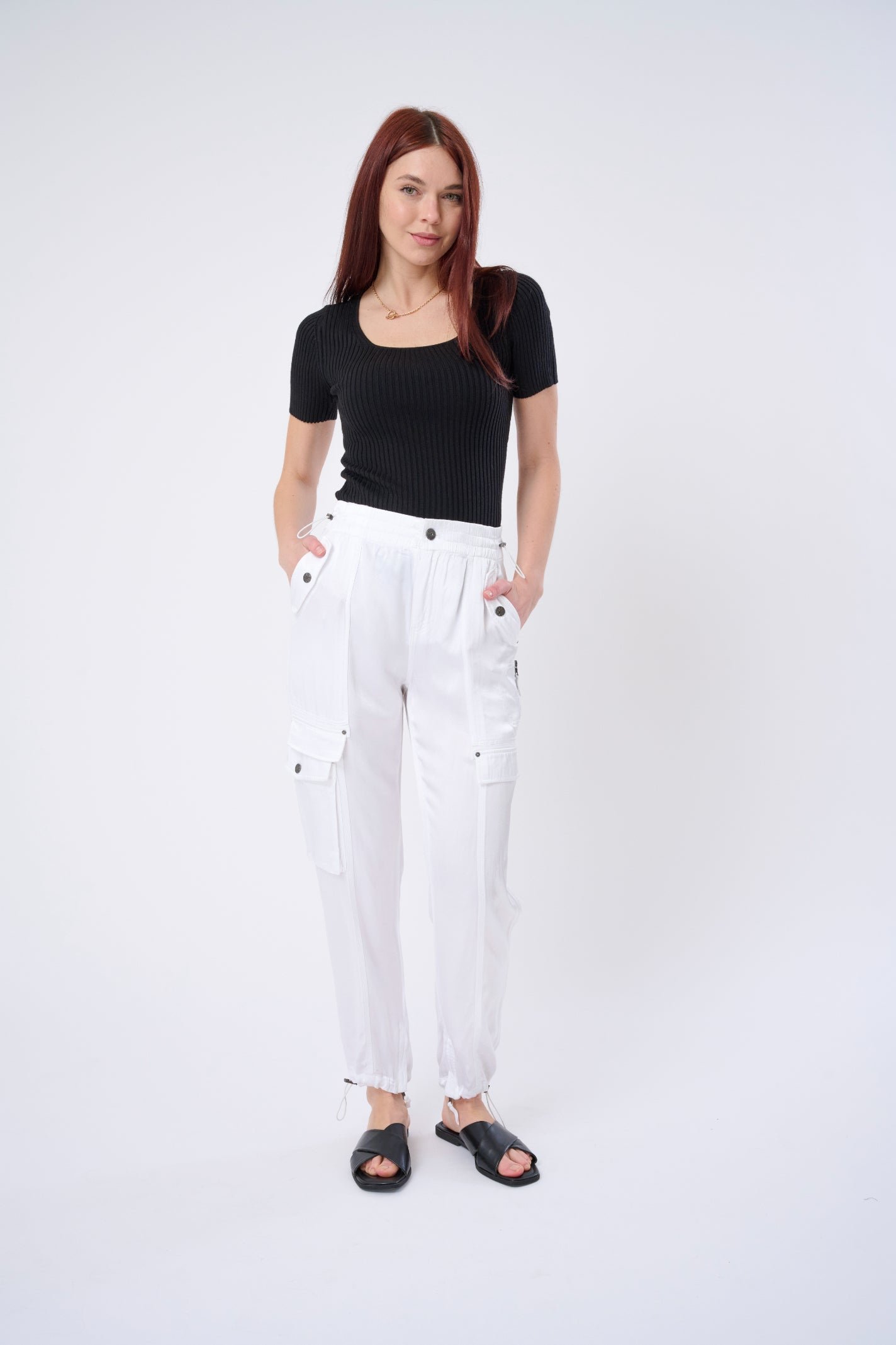 Meet the Nyra Pull-On Viscose Satin Cargo Pant. where laid-back ease meets elevated style. Designed with a smooth satin-soft finish and functional cargo details. these pants bring effortless sophistication to your everyday wardrobe. Featuring an elastic waistband with adjustable toggles for a personalized fit and utility pockets with snap button details. they blend comfort with a modern edge. Whether youre running errands. heading to brunch. or dressing up for a night out. these cargo pants offer versatility with a touch of luxury.
