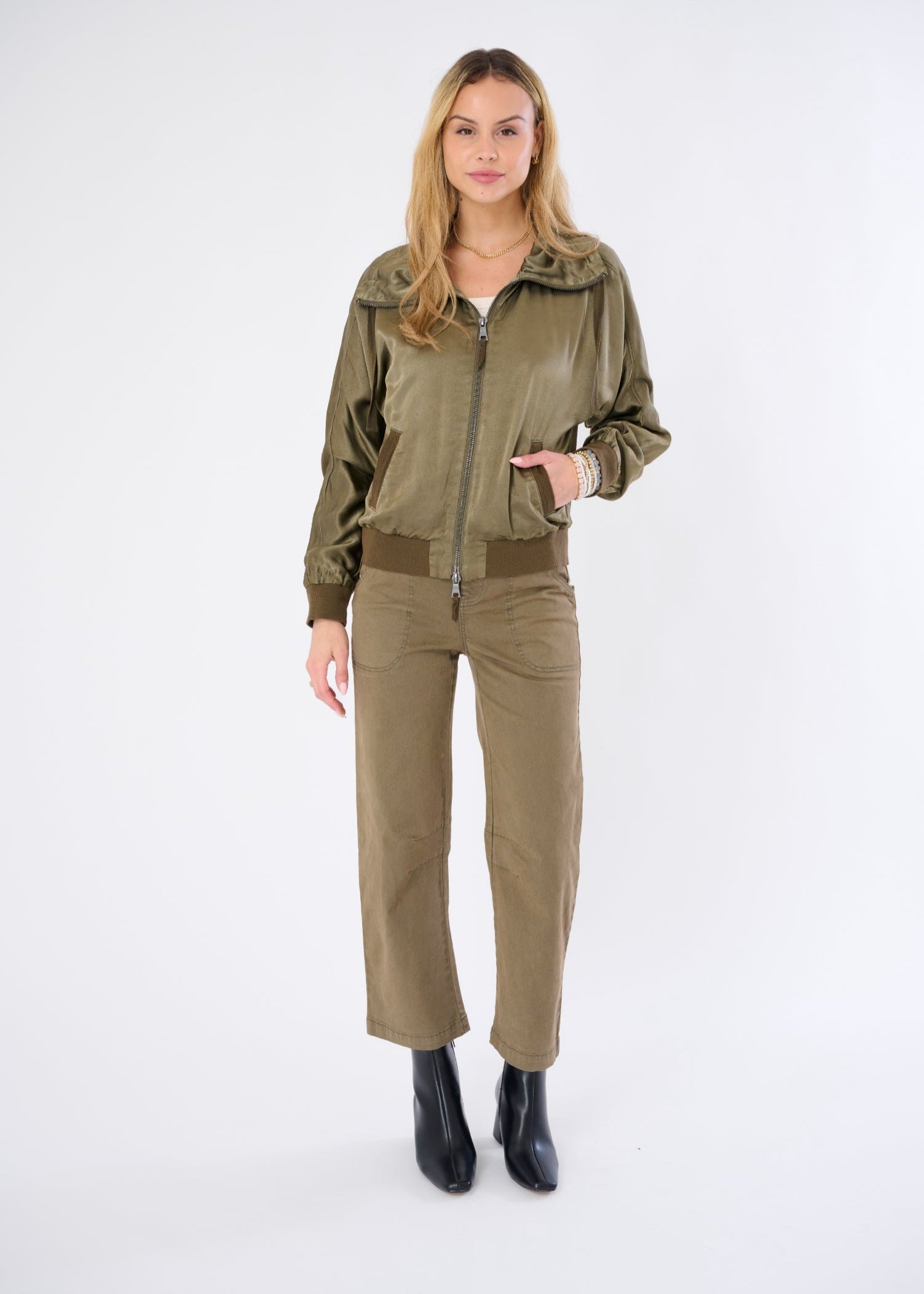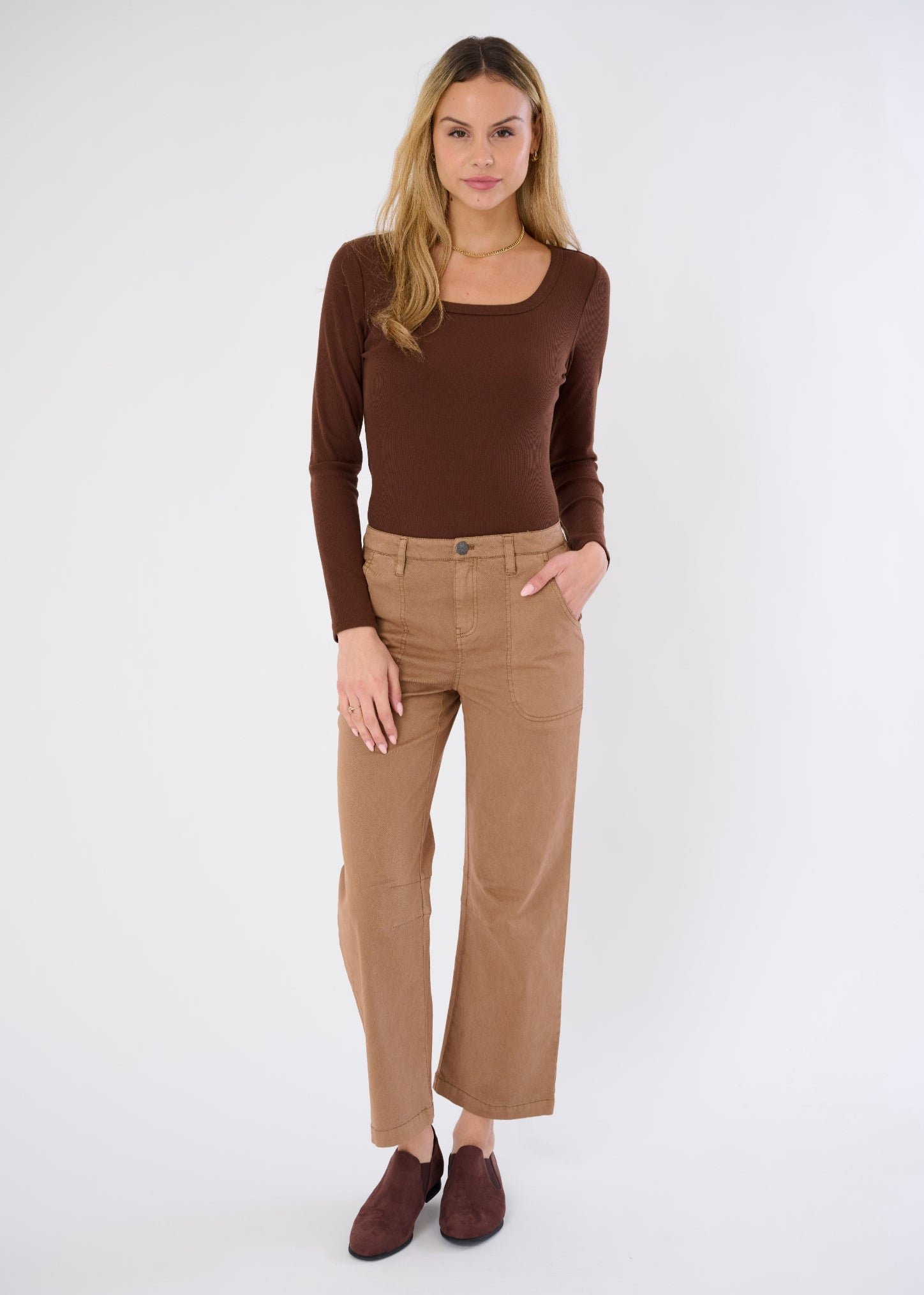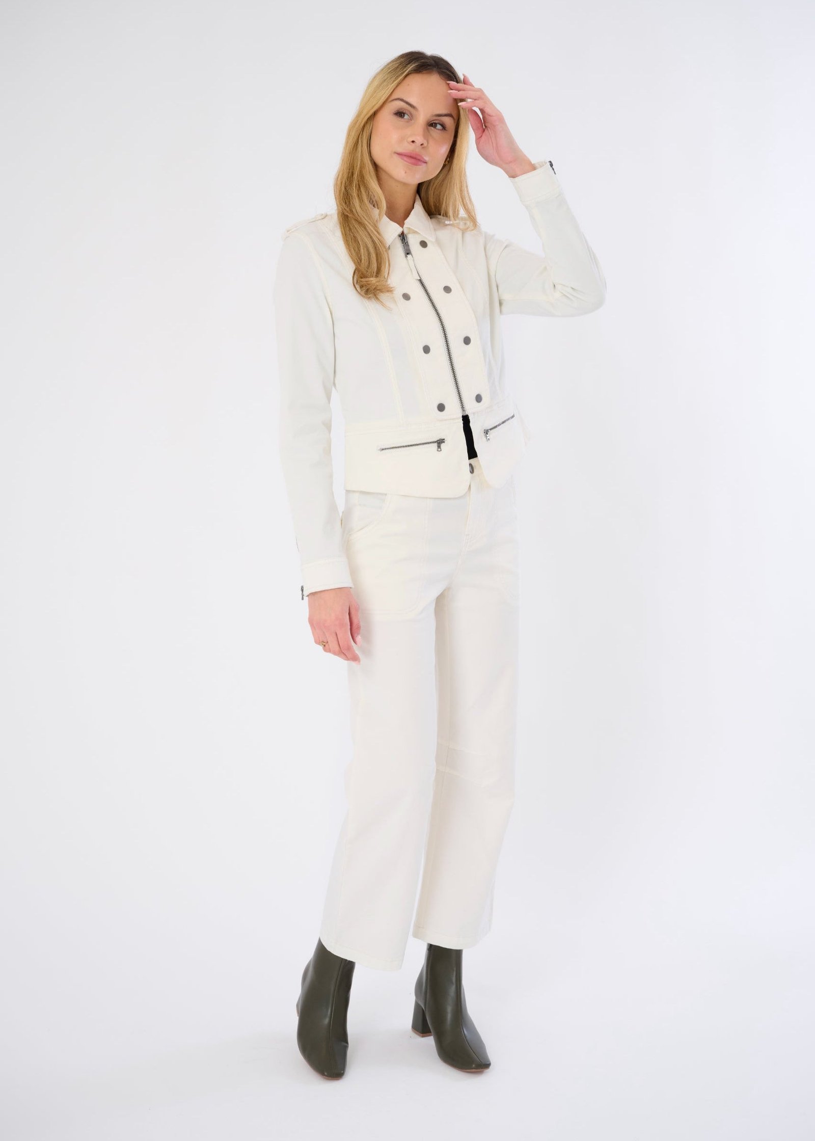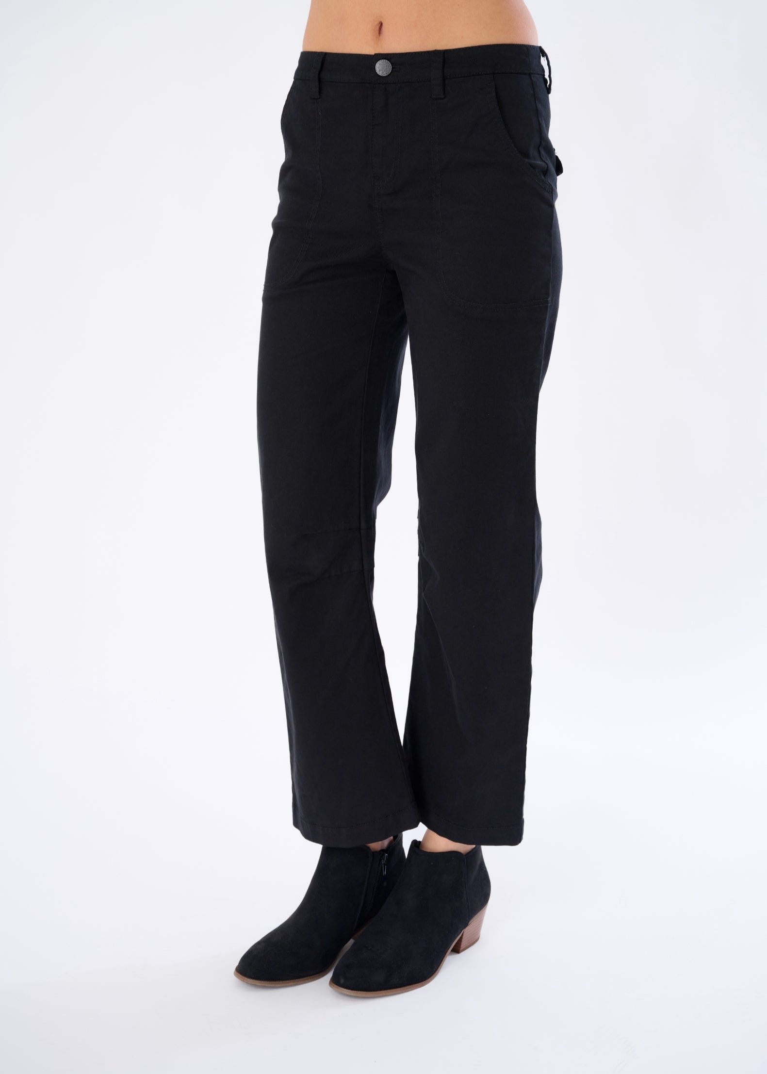 Polished Utility: Full pocket functionality plus snap-button detailing gives this pant real-world elegance.