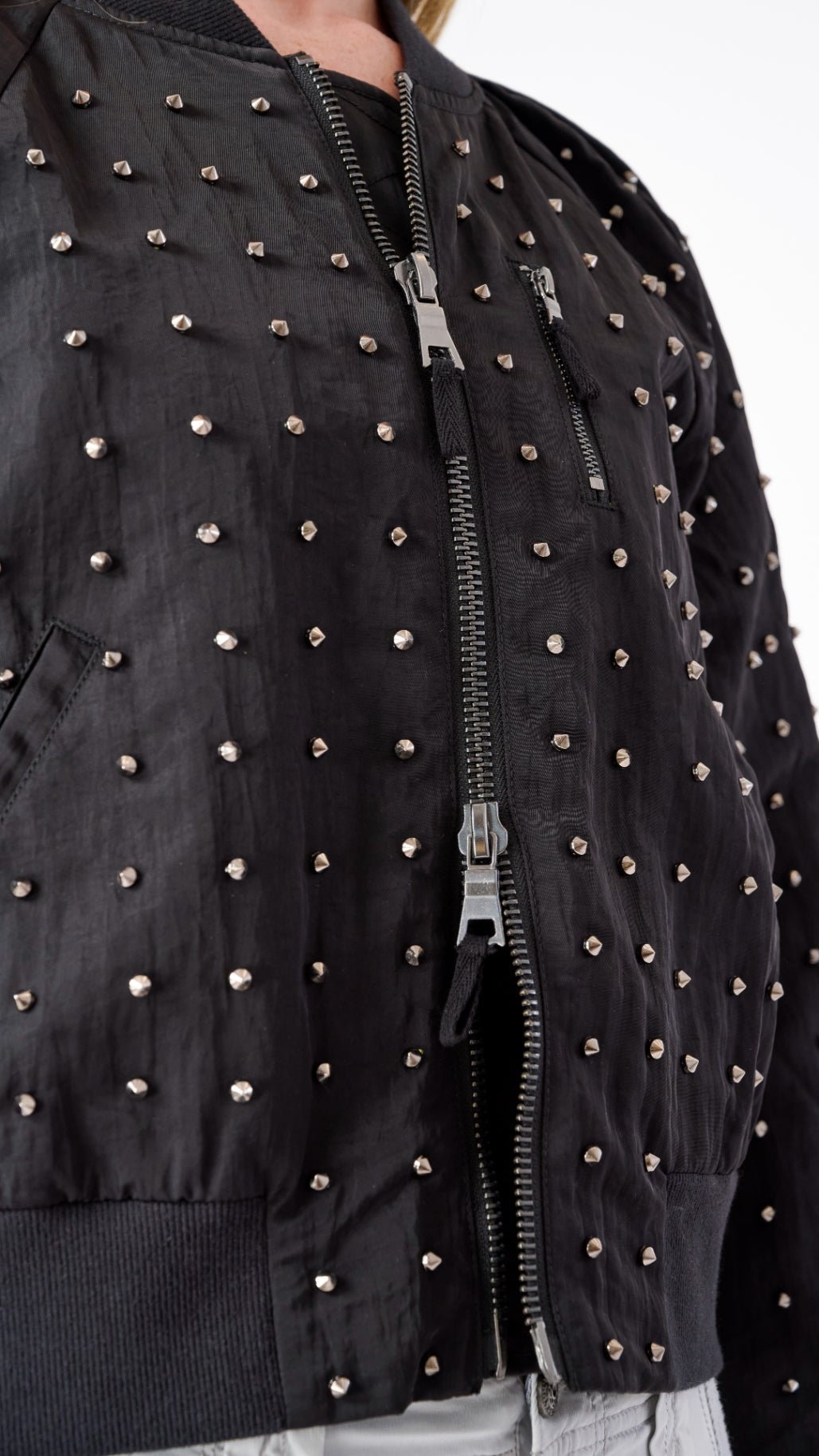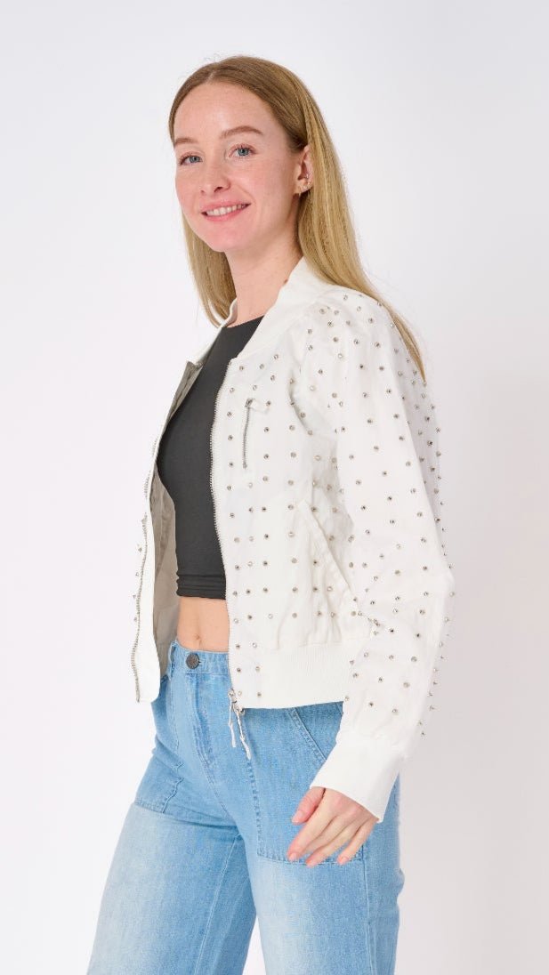 - Edgy Studded Details: Adds a bold. standout element to a classic bomber silhouette.